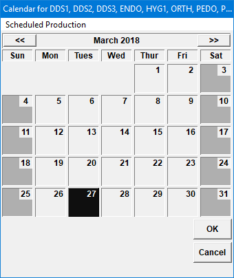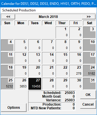 Dentrix includes a calendar from which you can view production goals, scheduled production, and actual production, making it easy for you to quickly evaluate your progress in meeting production objectives. In addition, you can click a date square to move to that date in the Appointment Book.