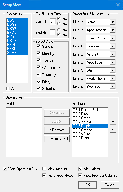 Operatories - From the Hidden column, select the operatories you want to view, and then click Add to add them to the Displayed column. To change the order of the displayed operatories in the Appointment Book, click Move Up or Move Down until the operatories in the order you desire.