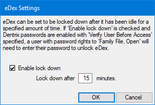 If you enabled passwords in Dentrix, you can configure eDex to lock users out after a specified period of time. You can then use the same password to open eDex that you use to open other Dentrix modules.