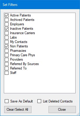 To set a filter, you select the contact categories that you want eDex to search. This in turn determines what types of entries appear in the Contacts List. Setting filters greatly reduces the amount of time that a search may take, especially if you have a large database. By default, there are 12 contact categories in the Set Filters dialog box rather than the 13 contact categories that appear in the Edit Contact Categories dialog box. The List Deleted Contacts category is separate from the Set Filters list. You can add categories according to the needs of your practice.