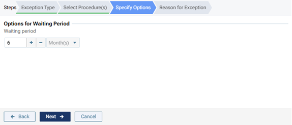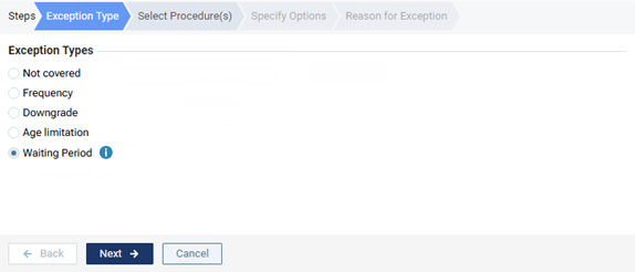 If a "Waiting Period" exception already exists for a selected procedure, with that procedure's checkbox selected for this new exception, the existing "Waiting Period" exception for that procedure will be replaced with this new exception.