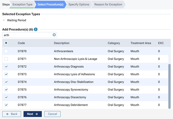 For a "Waiting Period" exception type, select the checkboxes that correspond to the procedure codes that have a waiting period.