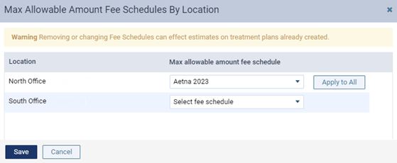 Max allowable amount fee schedule - The schedule of allowed charges for the insurance plan (PPO or DHMO plan only). The selected fee schedule will be used to determine a patient's portion and the recommended write-off.