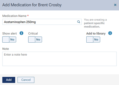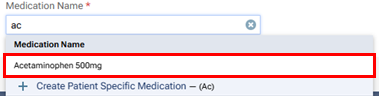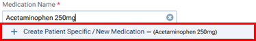Note: If the entire text that you have entered matches the entire name of a medication in your library, the option to create a patient-specific/new medication is not available.