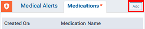 On a patient's Overview page, the Medications tab of the Medical Alerts/Medications box displays any medications that have been entered for the patient. Click (or tap) Add.