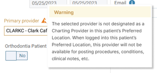 Note: A warning message appears if the selected primary provider is not designated as a charting provider in the patient's preferred location. A provider can be designated as a charting provider per location in that provider's user account settings.
