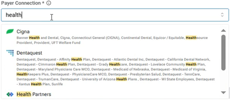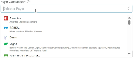 When you click in the box, a list of available payer connections appears. Next to each connection name, there is now an icon to represent the corresponding insurance carriers. Also, under each connection name, the associated insurance carriers now appear so you can more easily identify which insurance carriers belong to a connection.