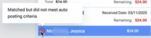 A red alert icon appears next to the patient's name. If you position your pointer over the red alert icon (a red triangle inside a circular arrow), "Matched but did not meet auto posting criteria" appears.