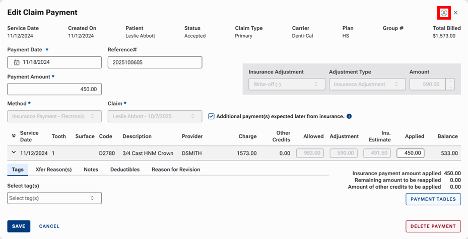 The upper-right corner of the Edit Claim Payment dialog box.