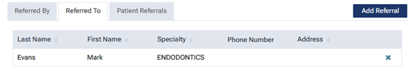 Note: To remove a referral from the patient's record, click the corresponding X, and then click Delete on the confirmation message that appears.