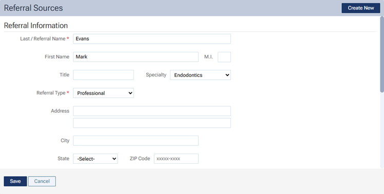 Add a new referral source to your database and attach that to the patient's record - Use the search box to search by name to make sure the referral source does not already exist, click (or tap) New Referral Source, enter the referral's information, and then click (or tap) Save.