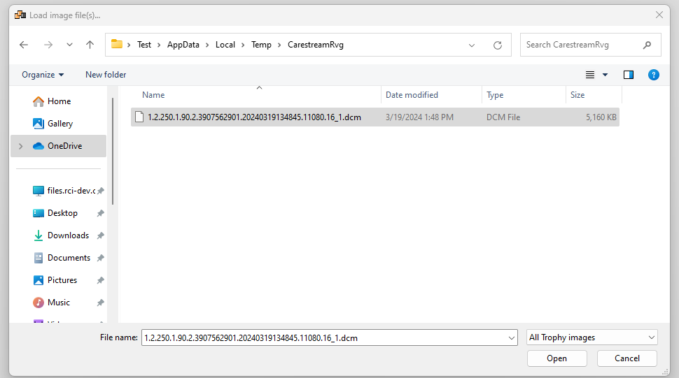 In the Load image file(s) dialog box, navigate to %temp%/CarestreamRvg, and then double-click the .dcm file to view it in the program without any processing applied