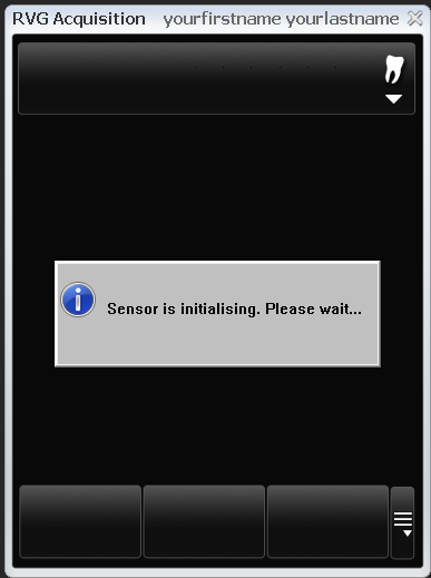 The RVG Acquisition window appears and displays a "Sensor is Initialising. Please wait..." message while the correction files are being copied from the sensor. This will only happen once. After the files are copied, the sensor will arm, and you will see a 90 second countdown to acquire an image.