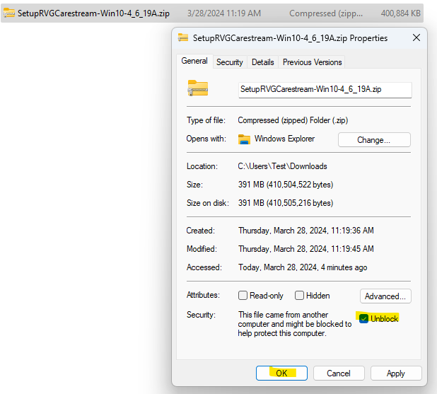 Note: Make sure you unblock the .zip file for the drivers before extracting it. To unblock the file, right-click it, select Properties, select the Unblock checkbox, and then click OK.