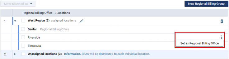 Expand the option menu (three dots) of the location to be designated as a regional billing office, and then click (or tap) Set as Regional Billing Office.