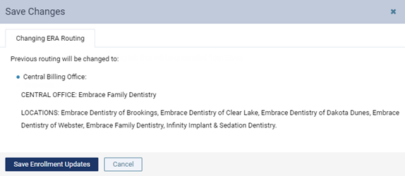 If ERAs are being routed to a central billing office, an enrolled location must be selected as the billing office, and at least one location must be enrolled.