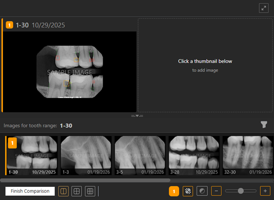 On the Images for tooth range panel, select an image to compare to the original. If the number of frames is four or six, select additional comparison images as needed. As you select each comparison image, it appears in the next available frame of the viewing area. Each frame with an image has color and number indicators, and the corresponding image on the Images for tooth range panel has the same color and number indicators.