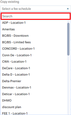 Note: To help you quickly locate the fee schedule from which you want to copy fees to populate the new fee schedule, the Copy existing list has a Search box. Begin begin typing part of a fee schedule's name to view the matching fee schedules. Continue typing as needed to narrow down the list of results.