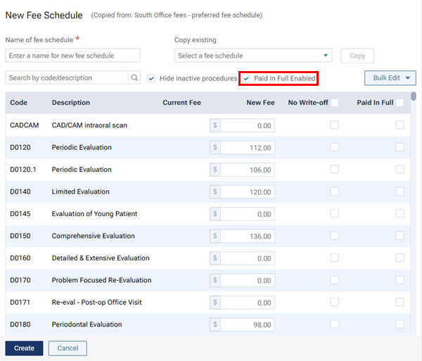 To enable "Paid in Full" procedures for the fee schedule, select the Paid in Full Enabled checkbox. With this checkbox selected, a Paid in Full column is available for the list of procedures.