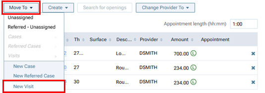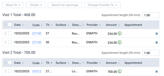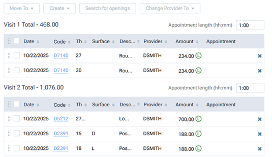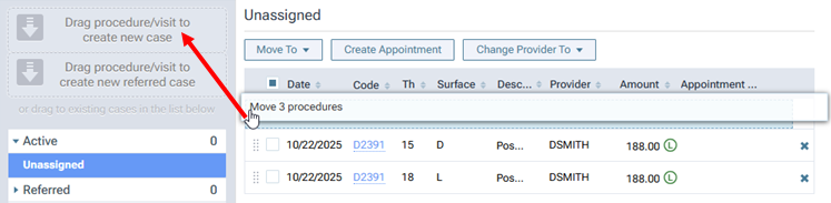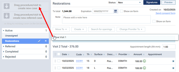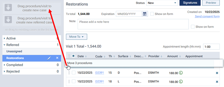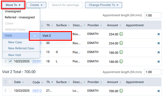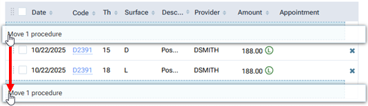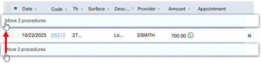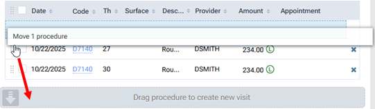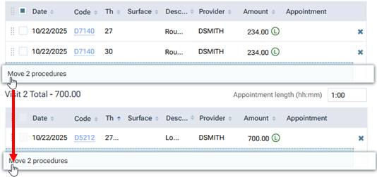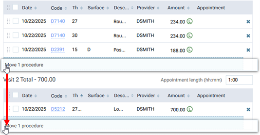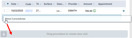 To move an individual procedure to an existing visit, drag that procedure (using the handle