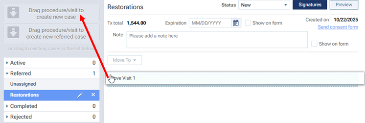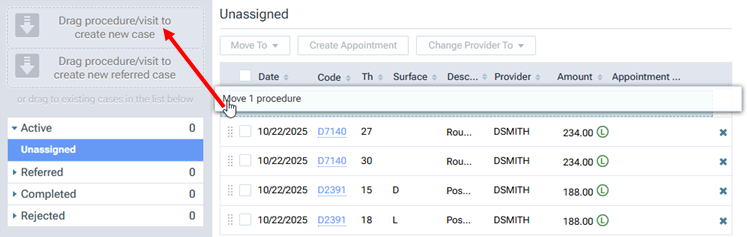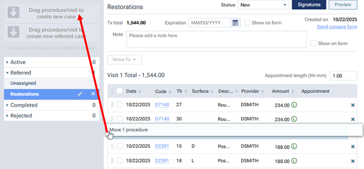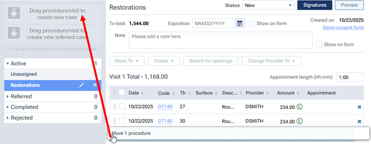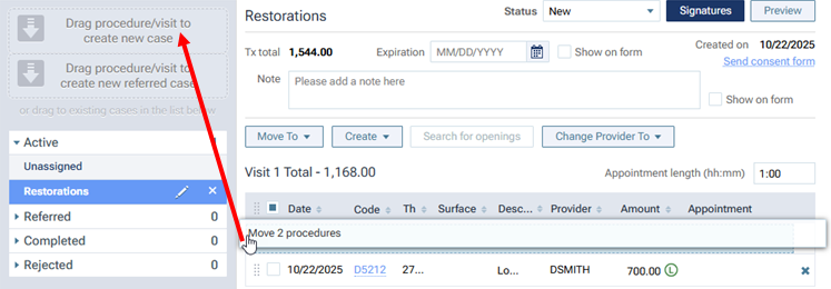 To create a new visit for an individual procedure, drag that procedure (using the handle
