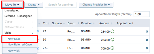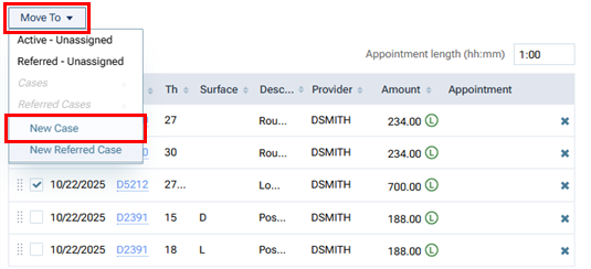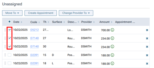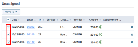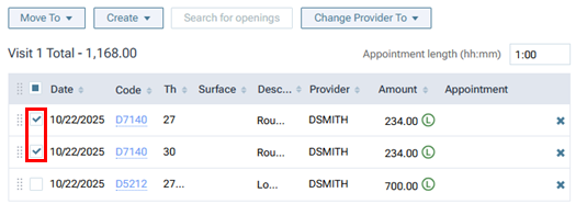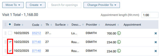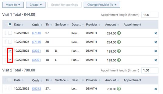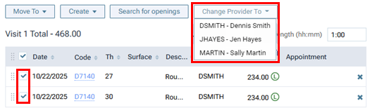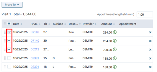 To move multiple procedures to an existing visit, select the checkboxes of those procedures.