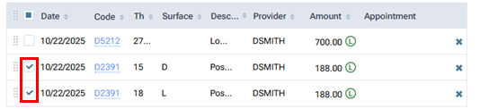 To create a new visit for one or more procedures, select the checkbox of each procedure.