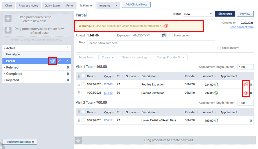 If any of the procedures in the case that are being billed to insurance require a predetermination (pre-authorization), according to the patient's primary insurance plan settings, a yellow warning message appears, and a Predetermination Required symbol