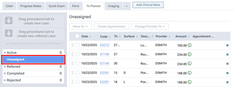 On the navigation panel (on the left), under Active, select Unassigned. The procedures that have not been assigned to a case appear on the right.
