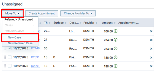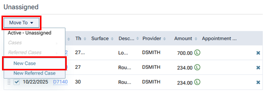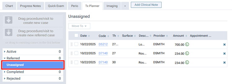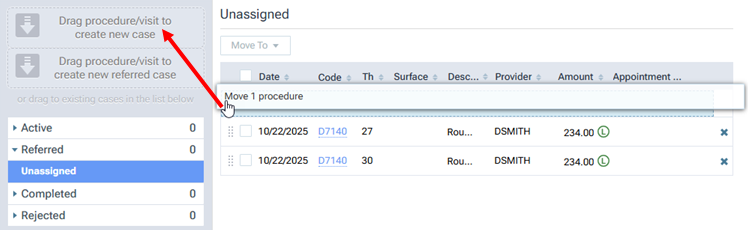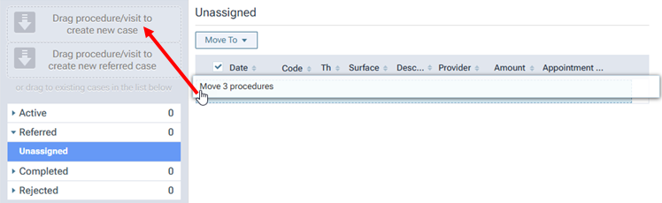 On the navigation panel (on the left), under Referred, select Unassigned. The procedures that have not been assigned to a case appear on the right.