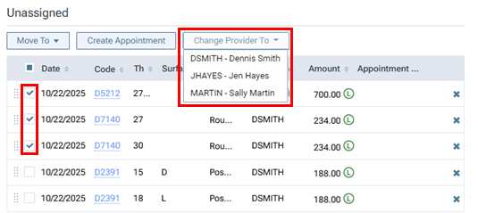 If the new provider has an assigned fee schedule, to update the amounts for the procedures based on that provider's fee schedule, select the Update procedure amount(s) based on this fee schedule checkbox. With the checkbox clear, the amounts for the procedures will not change. Then, click (or tap) Change.