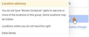 If you have not been granted the "Review Schedule" right for one or more locations that are assigned to an operatory group, an orange warning icon appears next to that group's name.