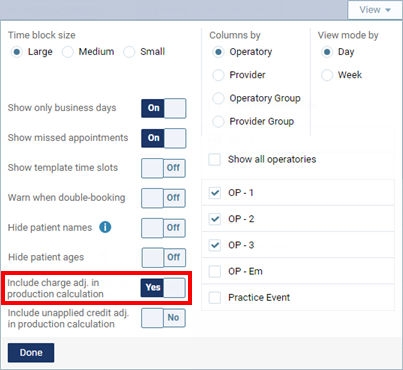 Include charge adj. in production calculation - To include or exclude charge adjustments in production calculations, set the switch to Yes or No.