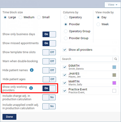 Show only working providers - If you are viewing the schedule by provider, you can choose to show columns only for providers who are available or to show the columns for all providers who are selected for the view. To show or hide working providers, set the switch to On or Off.