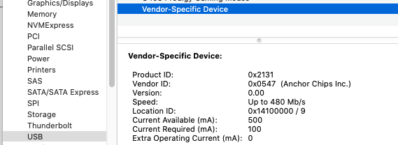 To confirm that the device is connected and being recognized by the Mac OS, open System Information, select Hardware > USB, and then make sure that the camera is listed.
