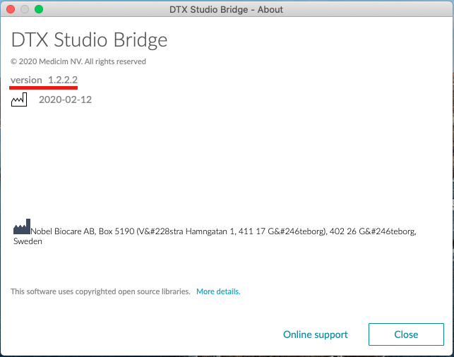 To view the version of DTX Studio Bridge that you are using, click the DTX Studio Bridge icon on the toolbar, click the gear icon, and then select About. The version number appears; make sure that it meets or exceeds the minimum version number listed in the "Minimum Versions" section.