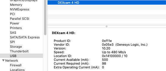 To confirm that the device is connected and being recognized by the Mac OS, open System Information, select Hardware > USB, and then make sure that the camera is listed.