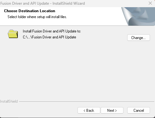 Note: By default, the location is C:\Program Files (x86)\Fusion Driver and API Update.