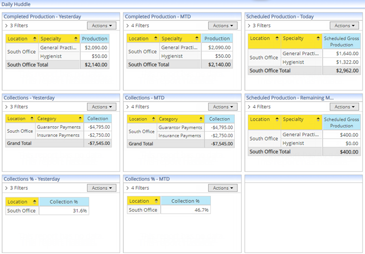 The Daily Huddle Dashboard - Production, Collections displays daily practice details for production and collections. Use this dashboard during your office's morning staff meetings to provide some daily statistics to help you focus on the patients coming in for treatment on the current day and/or the following day.