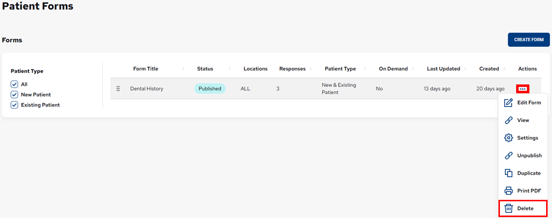 In the Actions column, click (or tap) the ellipsis of the form that you want to delete to view a menu, and then select Delete.