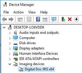 Expand the Imaging Devices category, and make sure that the camera is listed ("Digital Doc IRIS x64" or "Digital Doc IRIS x32").