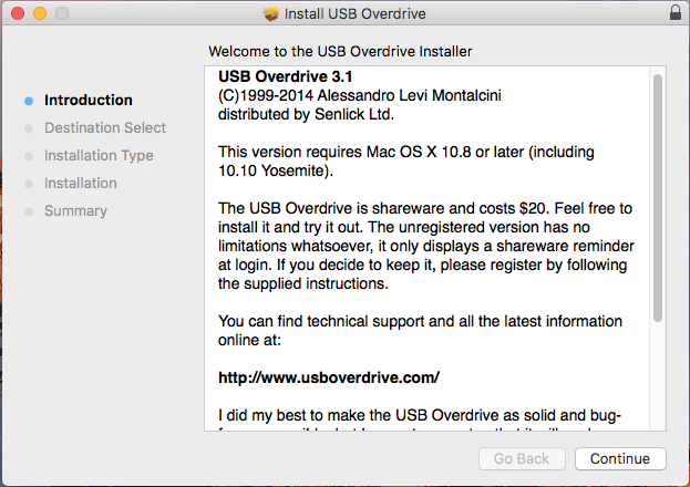 The Install USB Overdrive window opens, and the Introduction page is selected.