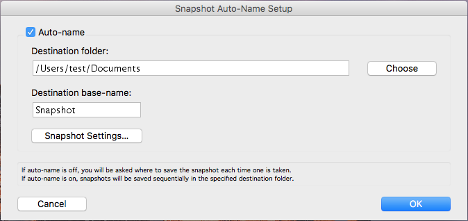 Select the Auto-name checkbox. Then, make sure that the Destination folder is set to your Documents folder and that the Destination base-name is Snapshot.