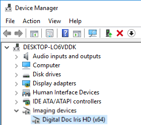 Expand the Imaging Devices category, and make sure that the camera is listed ("Digital Doc IRIS HD x64").