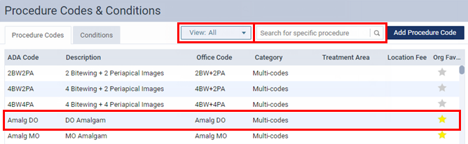 To filter the list of procedure codes, in the View list, select whether you want to view all procedures, only the favorites (most commonly used procedures), only active procedures, or only inactive procedures.