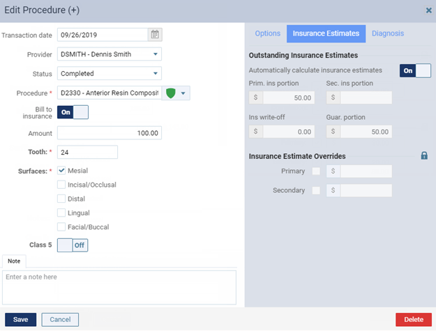 By default, Dentrix Ascend automatically calculates the estimated primary and secondary insurance portions, write-off, and guarantor portion for each procedure. However, you can turn off the automatic calculation for an unpaid procedure and modify the estimated primary and secondary insurance portions and write-off (which changes the guarantor portion accordingly).