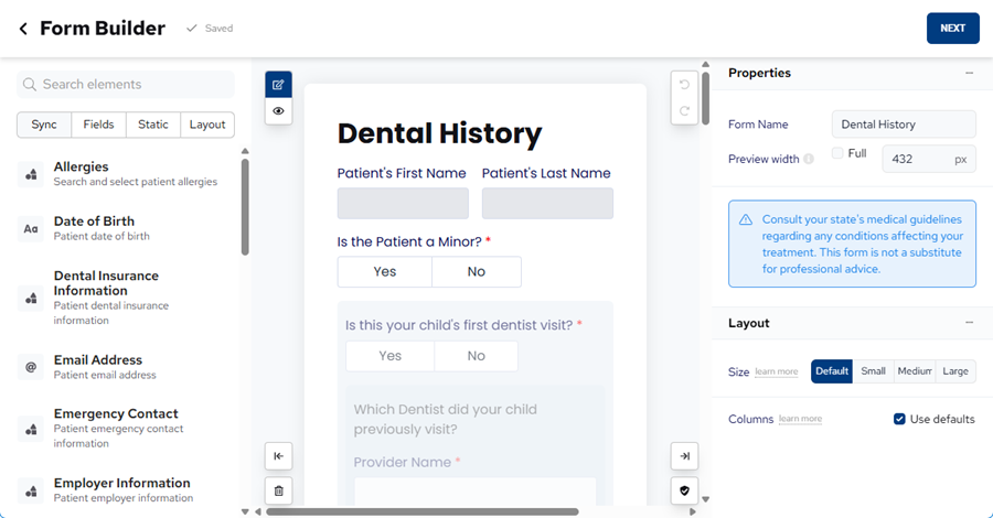 Note: You can filter the list of forms by their assigned patient types. Under Patient Type (on the left), either select All, or select New Patient or Existing Patient.