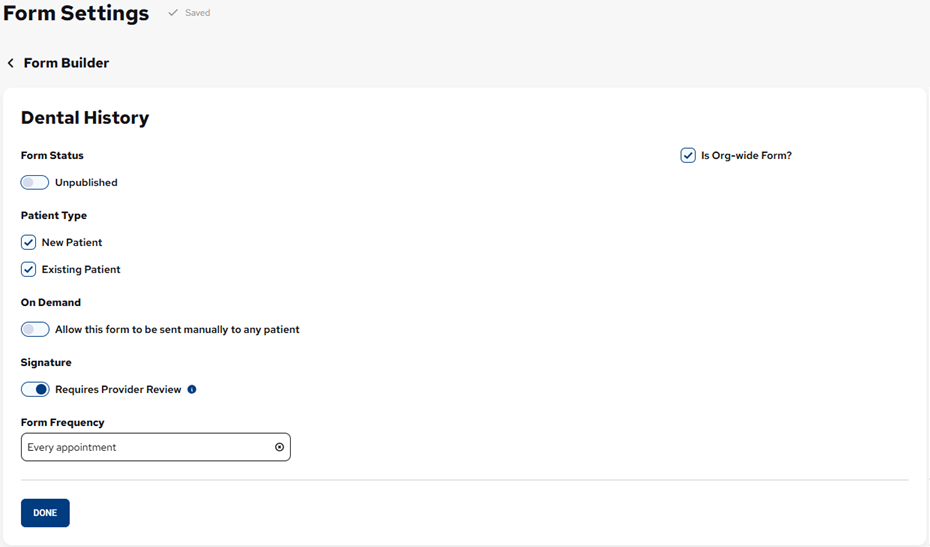 Note: If you have made any changes to a published form, its status becomes "Unpublished." It will never be due for any patient and cannot be requested on demand unless you re-publish it.