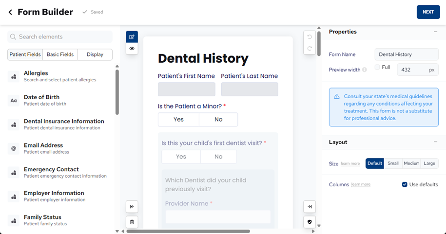 Make the necessary changes to the form, and then click (or tap) Next. For information about the available options, see the topic about creating patient forms.