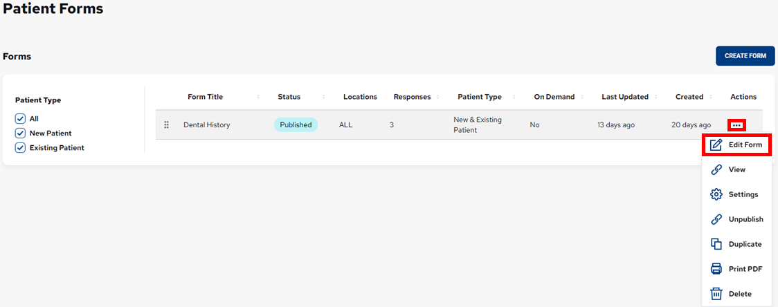 In the Actions column, click (or tap) the ellipsis of the form that you want to edit to view a menu, and then select Edit Form.